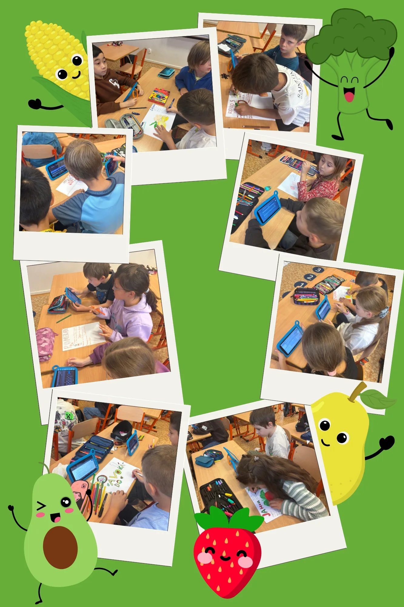 II. a IV. oddělení v rámci tandemového vzdělávání společně tvořilo informační plakáty. Ve skupinách a pomocí tabletů vyhledávali informace a obrázky o potravině, kterou si vylosovali.