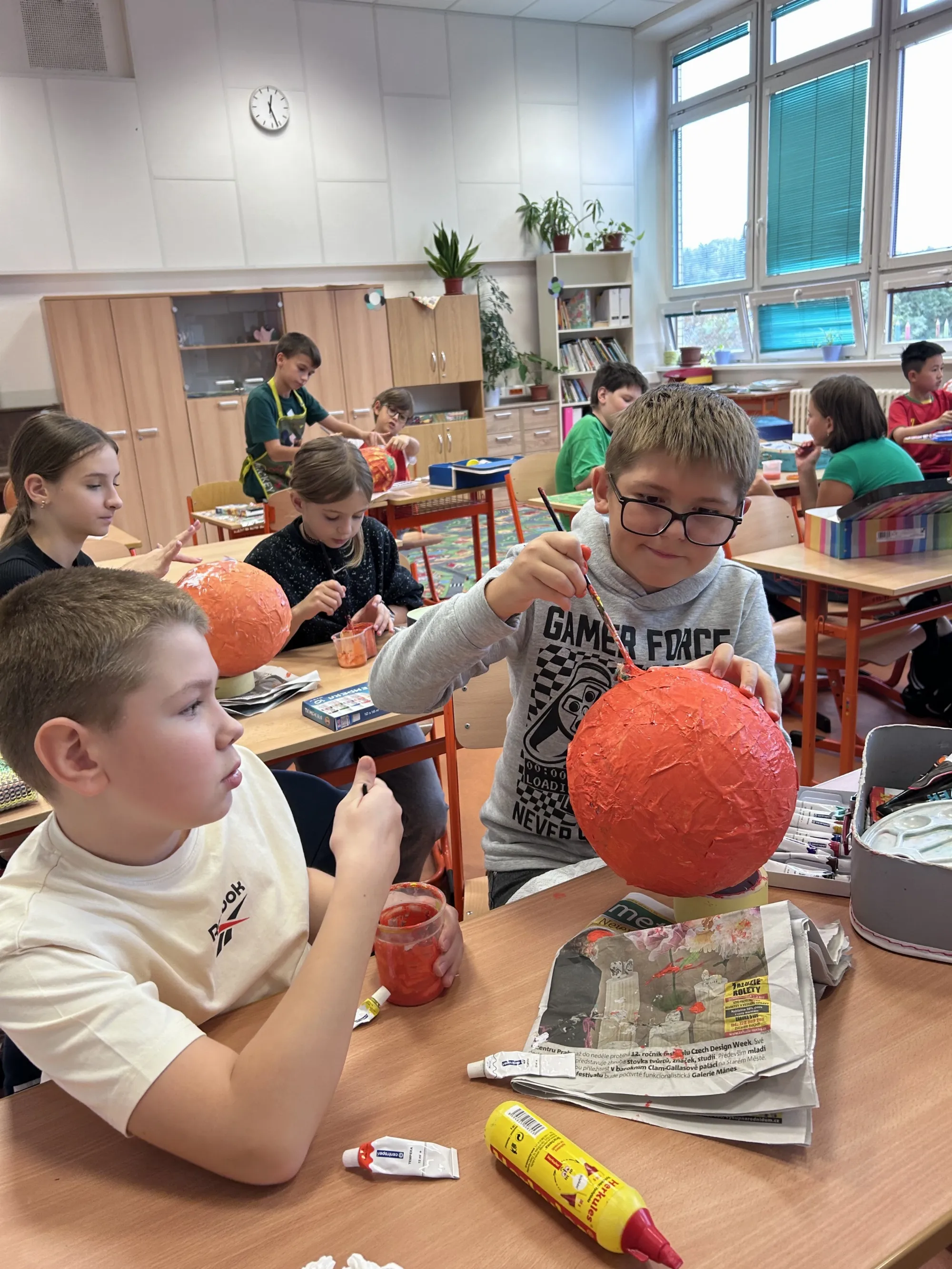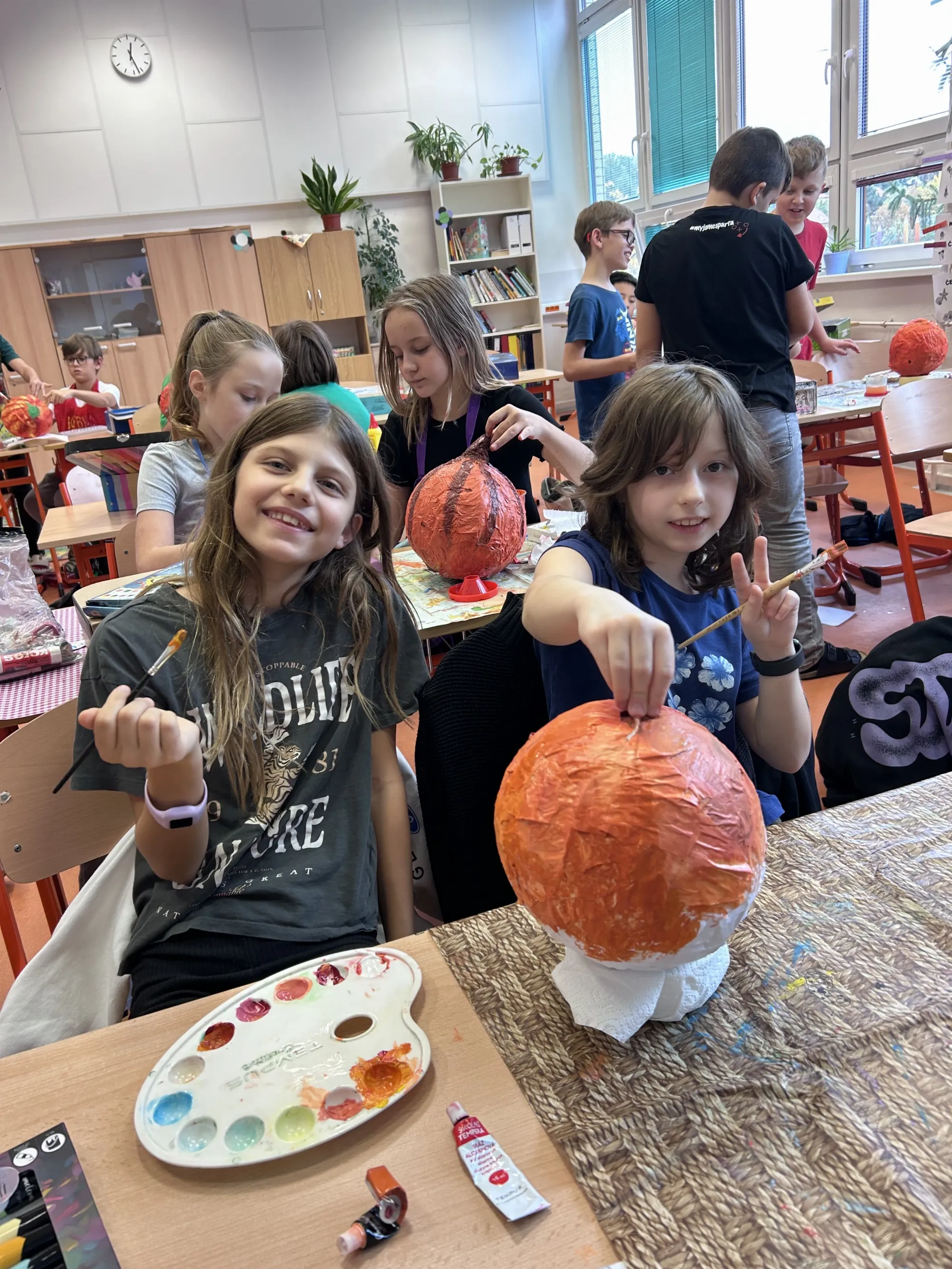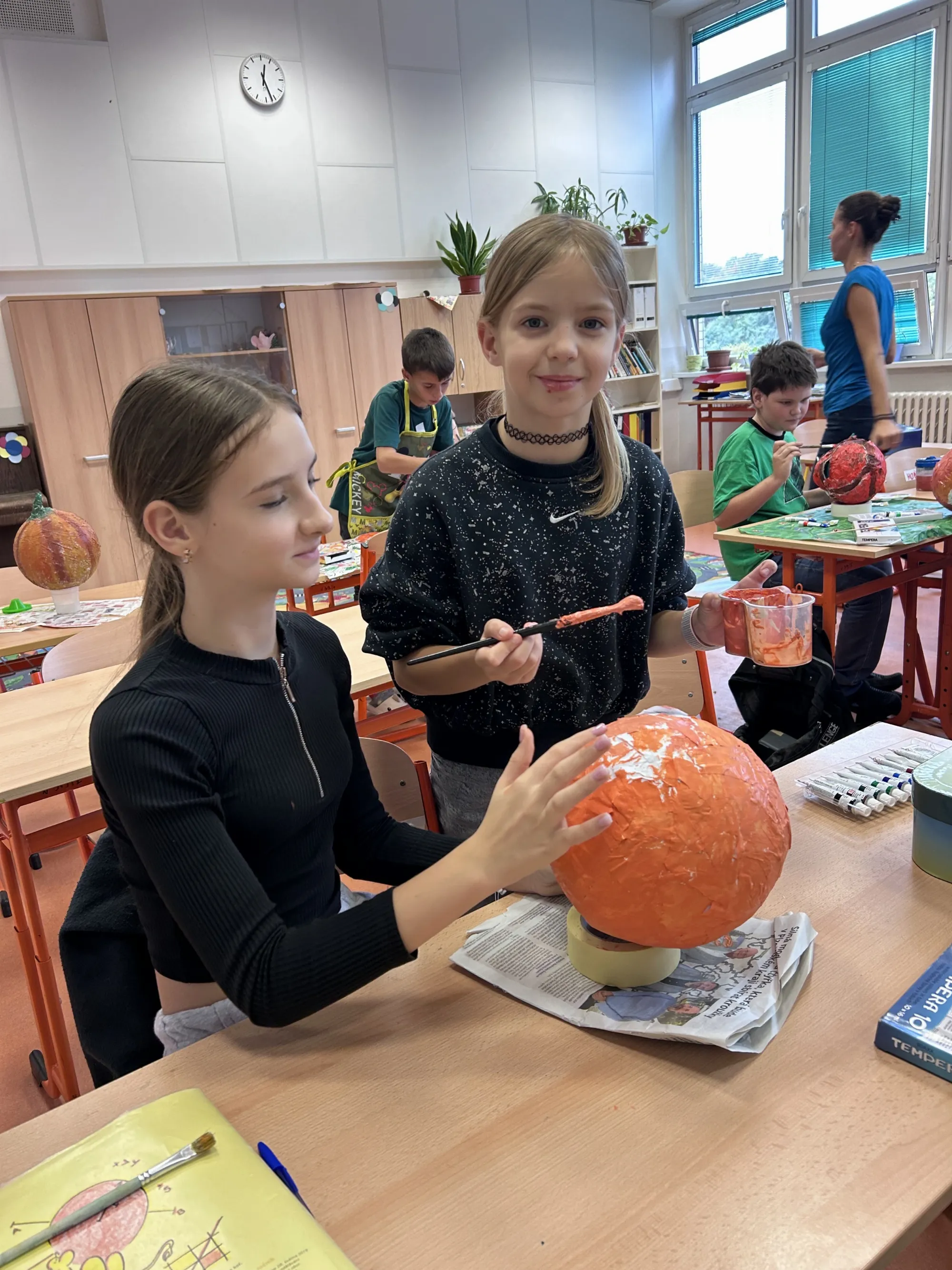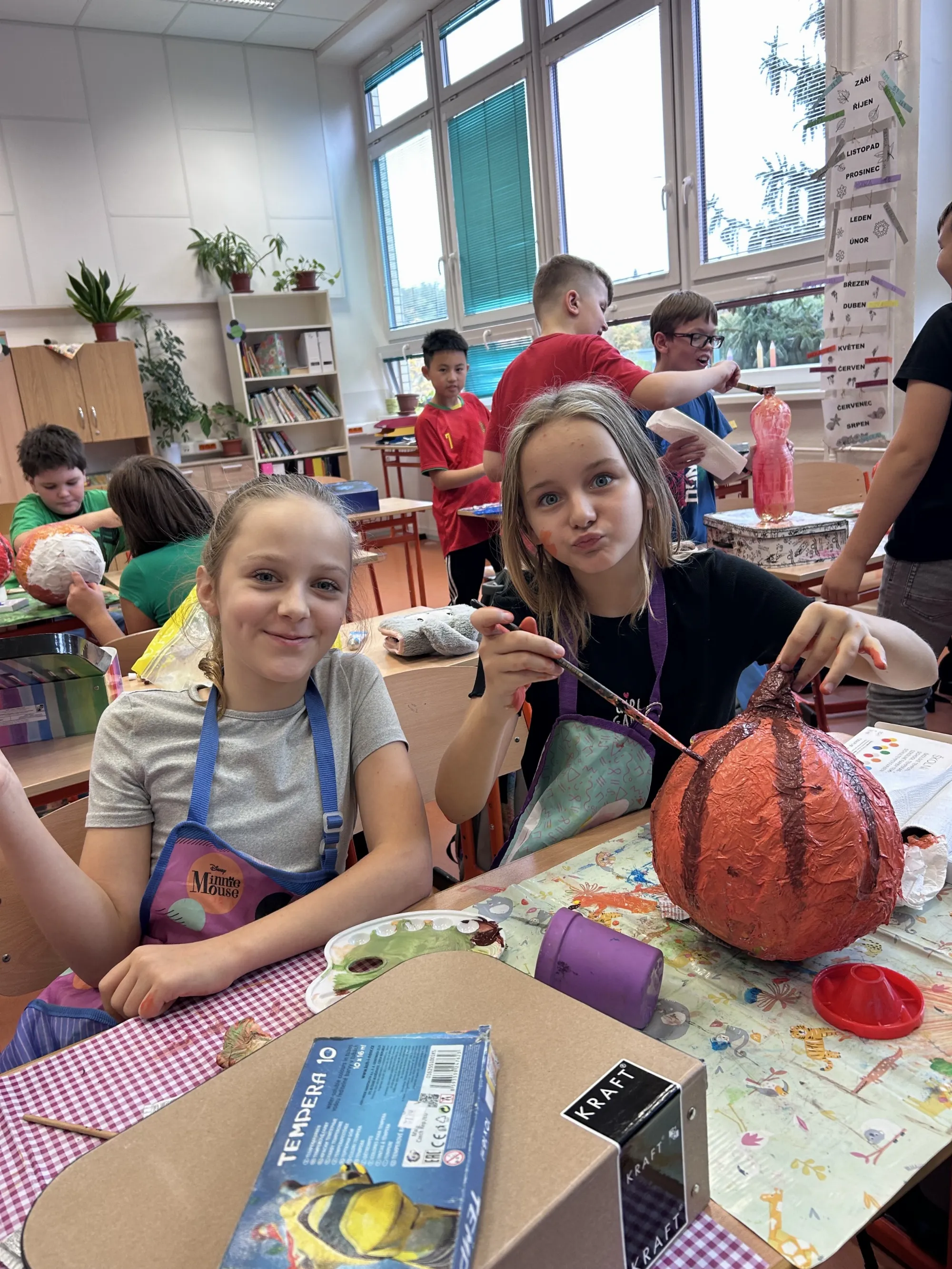 V říjnových hodinách pracovních činností 5.A vytvářela kašírované dýně, abychom měli vlastnoručně vytvořenou výzdobu třídy na Halloween.
