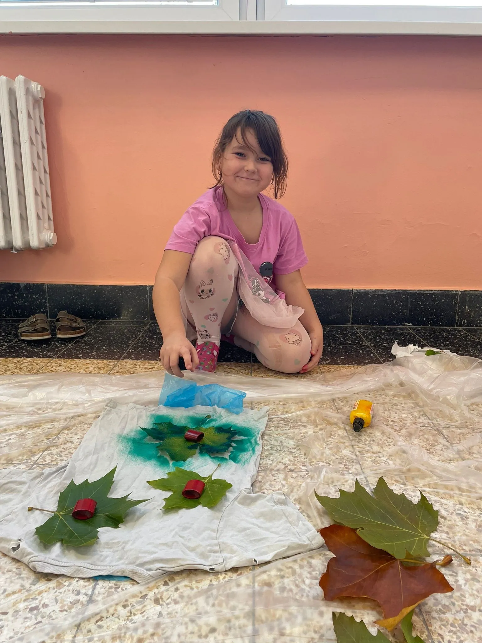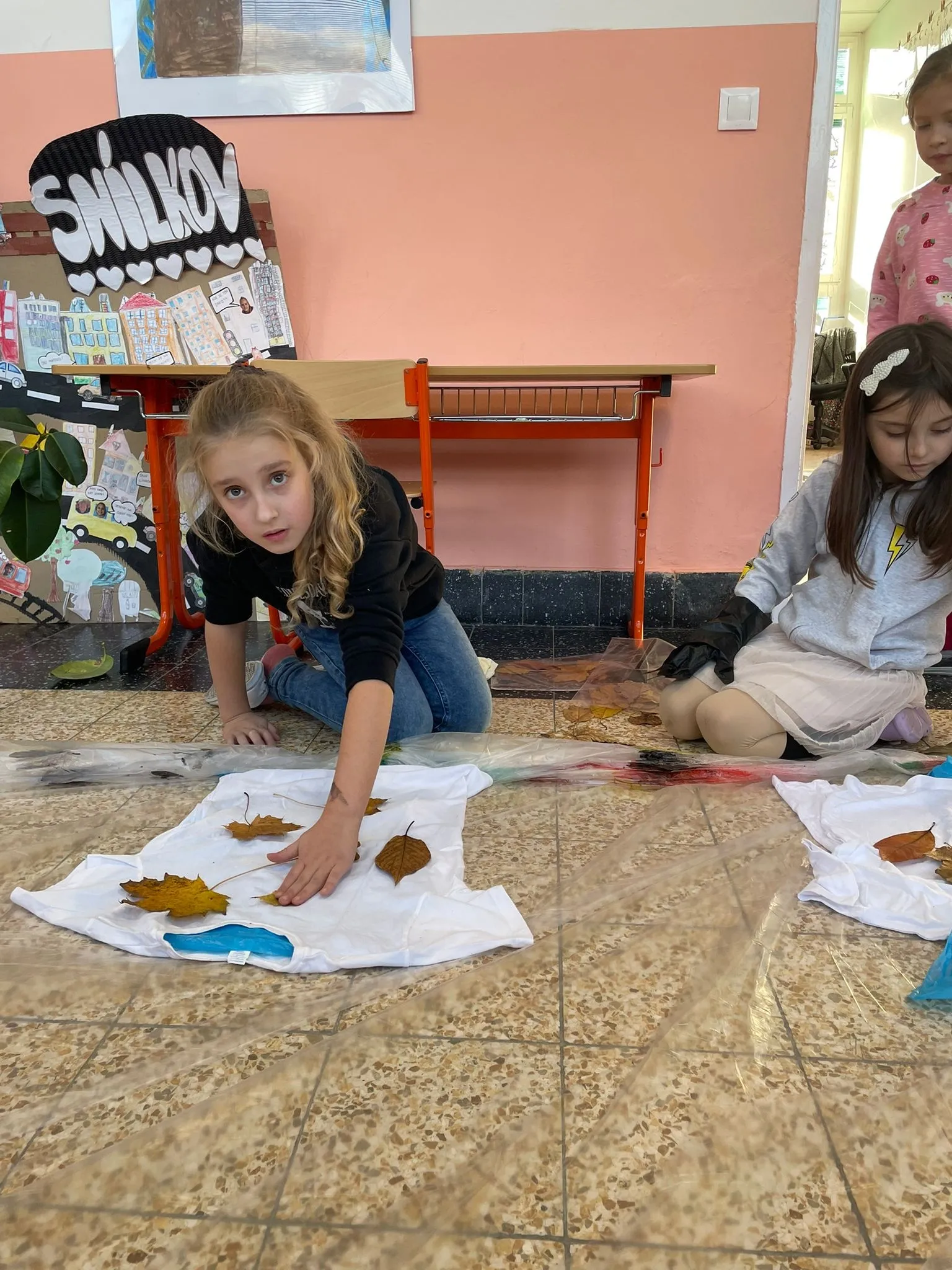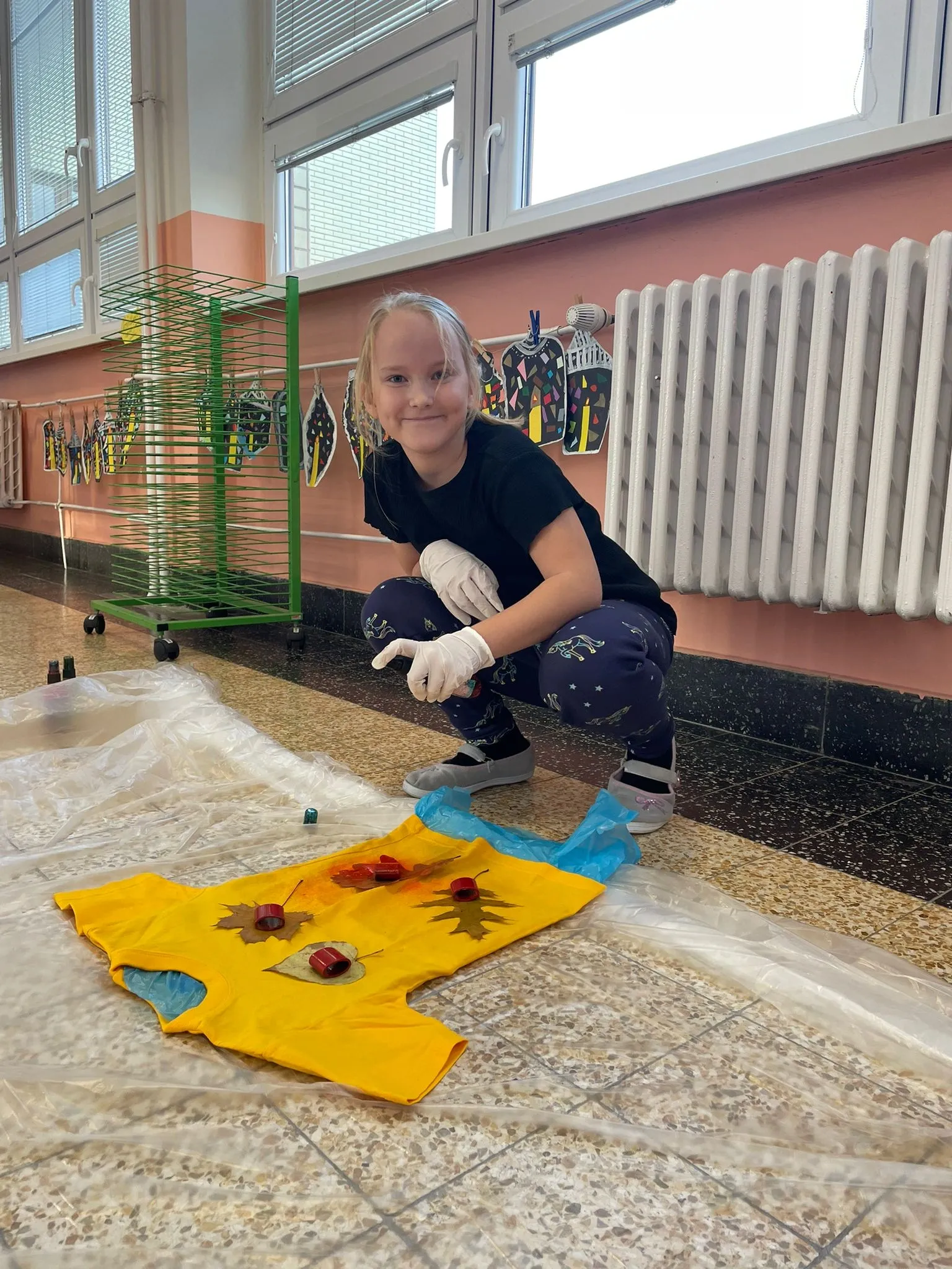 Následně se děti střídaly v barvení triček a mezitím tvořily podzimní obrázek. Barvy sice skončily skoro všude, ale trička se moc povedla a všem udělala velikou radost.