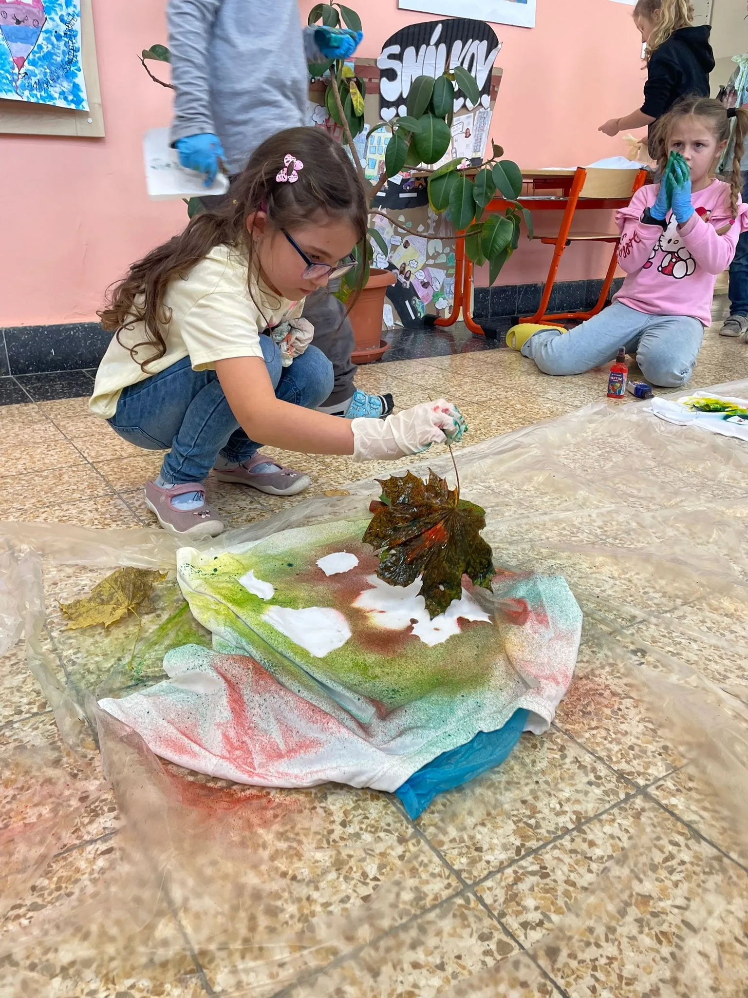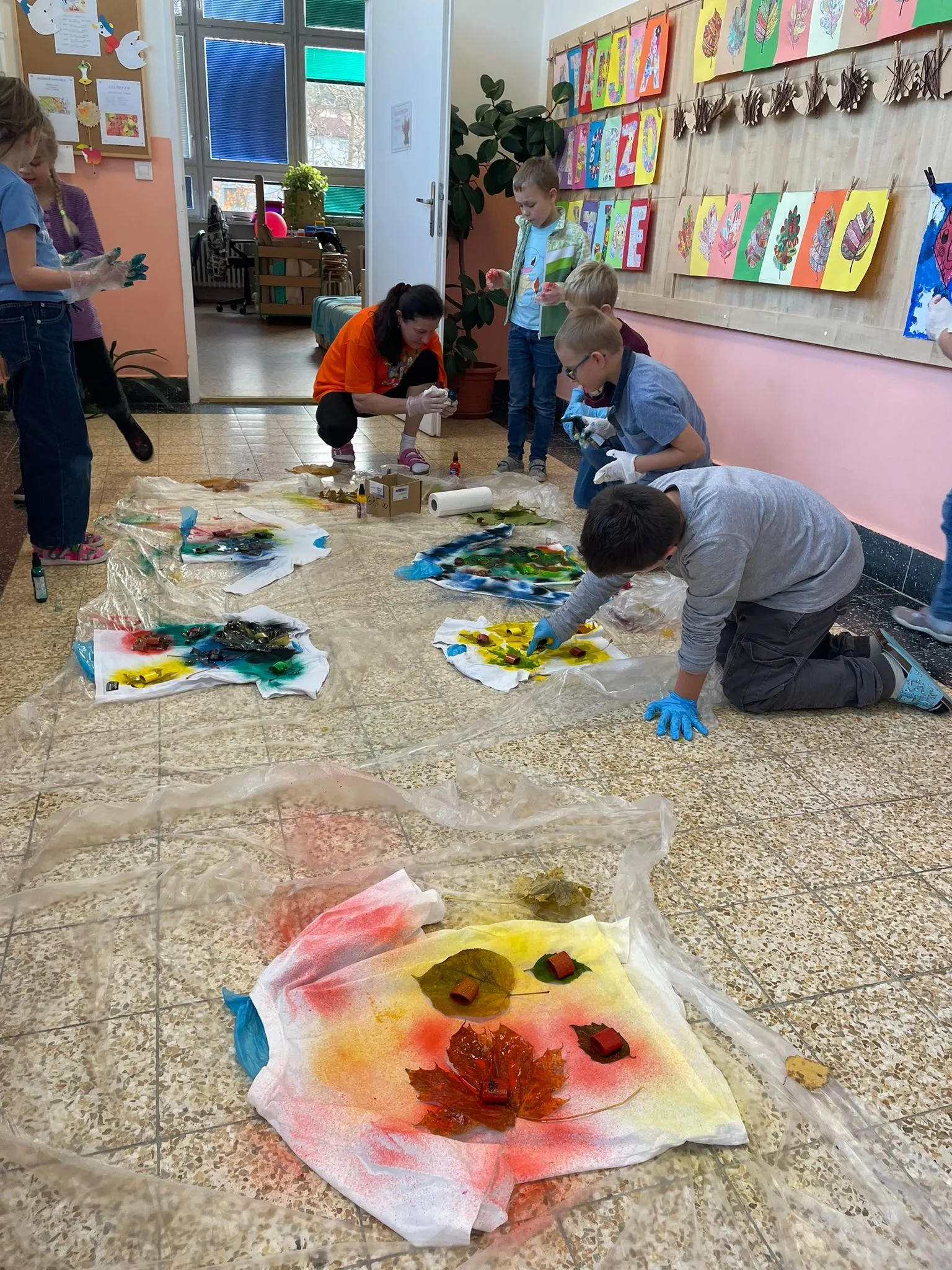 Tentokrát nás provázelo téma: Kouzlíme z listí. Nejprve se děti pomocí prezentace seznámily s barvami podzimu a s tím, proč se listy zbarvují a opadávají. Poté paní vychovatelka Veselá dětem ukázala, jakým způsobem si budou pomocí barev na textil a listů zdobit a barvit svá trička.